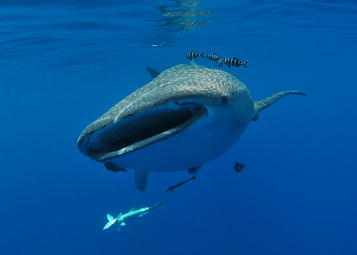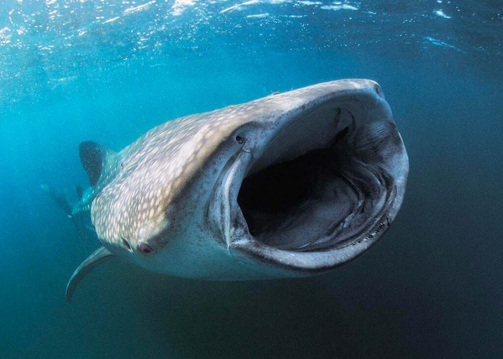 Bien qu’impressionnant, le requin-baleine est totalement inoffensif pour l’homme. Peu farouche, il peut parfois se montrer curieux et chercher les plongeurs du regard. Le géant se nourrit essentiellement de plancton, de krill, de crevettes et de manière plus opportunistes, de petits poissons n’excédant pas 10 centimètres comme les sardines ou les anchois.
