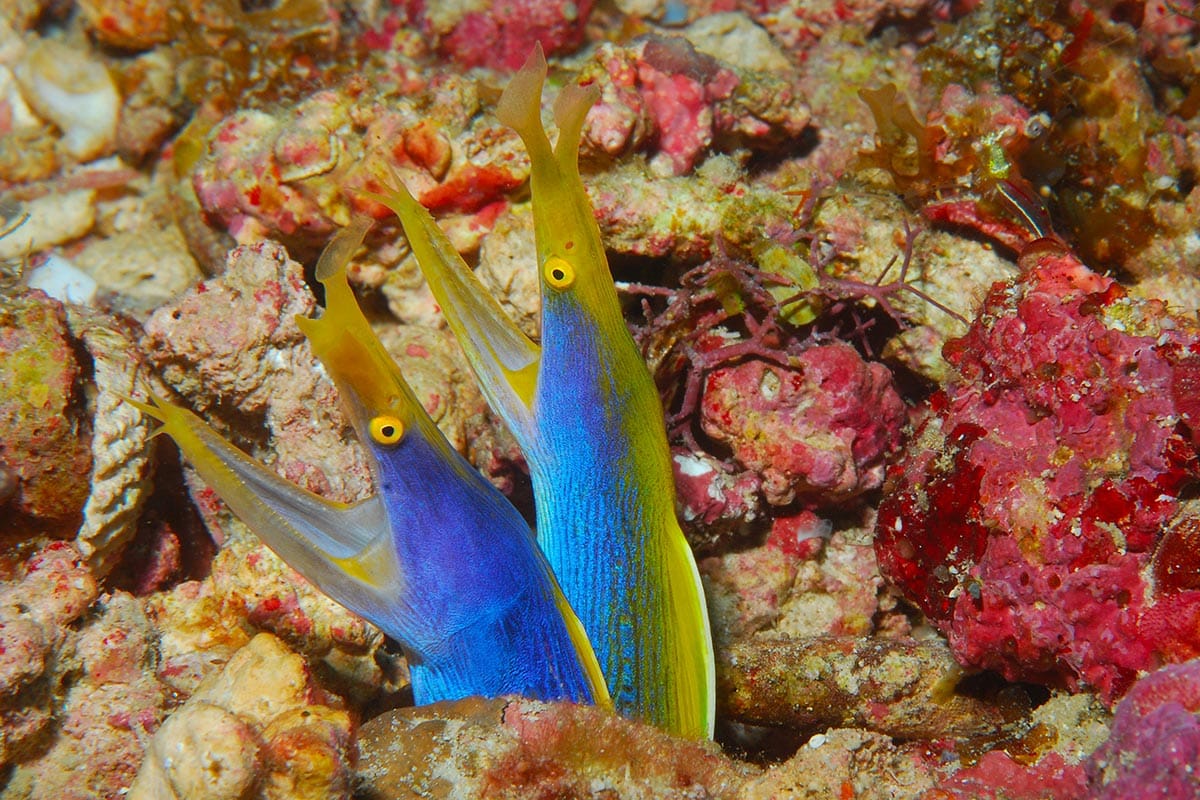 Le point d’orgue de votre croisière plongée aux Mitsio sera le Banc du Castor, un tombant couvert de gorgones spectaculairement grandes, ponctué de petites crevasses et cavités dans lesquelles viennent se nicher différentes créatures. Au nord-ouest de Tsarabanjina, vous ferez escale aux Quatre Frères, un autre lieu incontournable de votre croisière plongée. Les Quatre Frères représentent une suite de quatre monolithes aux parois rocheuses abruptes qui chutent de 20 à 30 mètres de haut dans l’eau. Là aussi, en plongée aux Quatre Frères, vous découvrirez tout un écosystème marin où de nombreuses espèces vivent en parfaite symbiose. Les récifs coralliens vous dévoileront leurs plus beaux visages, avec une succession de tables d’Acropora, du corail-cerveau de Neptune, des patates de corail abritant des milliers de demoiselles bleu-vert, des gorgones, éponges tubulaires et anémones. Des bancs de barracudas, de lutjans et de poissons-anges viendront s’ajouter au panorama, aux côtés des dauphins, des globicéphales et des requins-baleines pendant la saison.