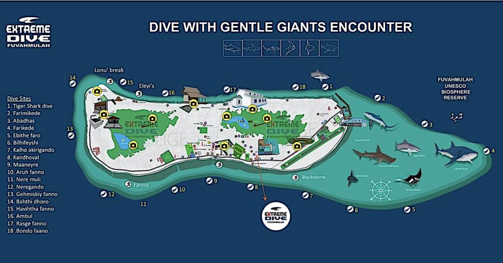 Les paysages sous-marins de Fuvahmulah sont un véritable spectacle naturel, captivant plongeurs novices et experts. L’absence de lagon donne directement accès à des eaux profondes où des tombants vertigineux se tapissent de coraux mous et durs, illuminés par une palette de couleurs éclatantes. Les fonds sont peuplés d’éponges géantes et de gorgones, offrant refuge à une vie marine dynamique peuplée de poissons tropicaux. Les amateurs de gros en auront aussi pour leur compte :