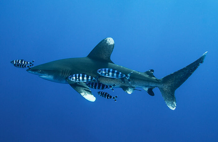 • Ne reculez jamais devant un requin qui se dirige vers vous. Positionnez-vous tranquillement à la verticale et laissez pendre vos palmes.